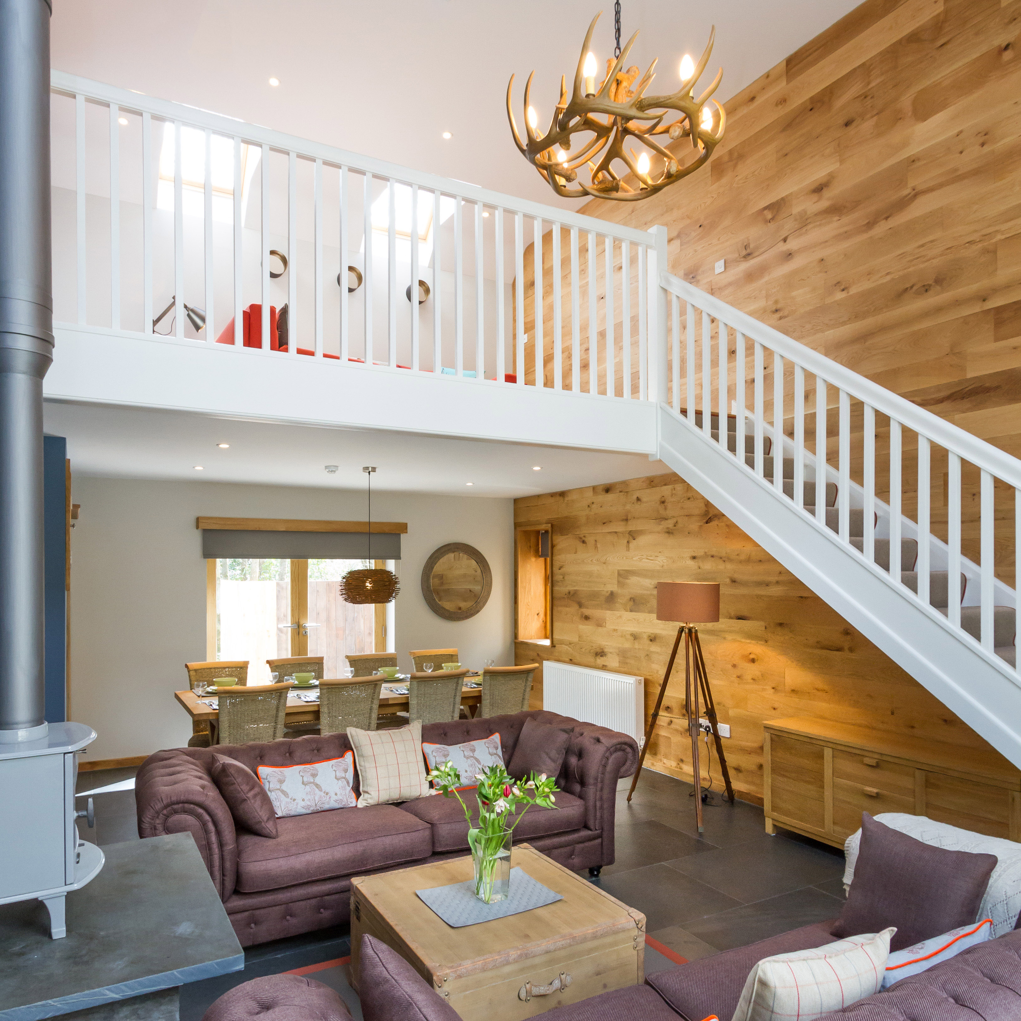The Cedars offers spacious accommodation for 10 people, in 5 double bedrooms (3 en-suite), with a double height galleried lounge with a log burner, a dining area with space for 10, and a well equipped kitchen with Neff appliances and a built in coffee machine.